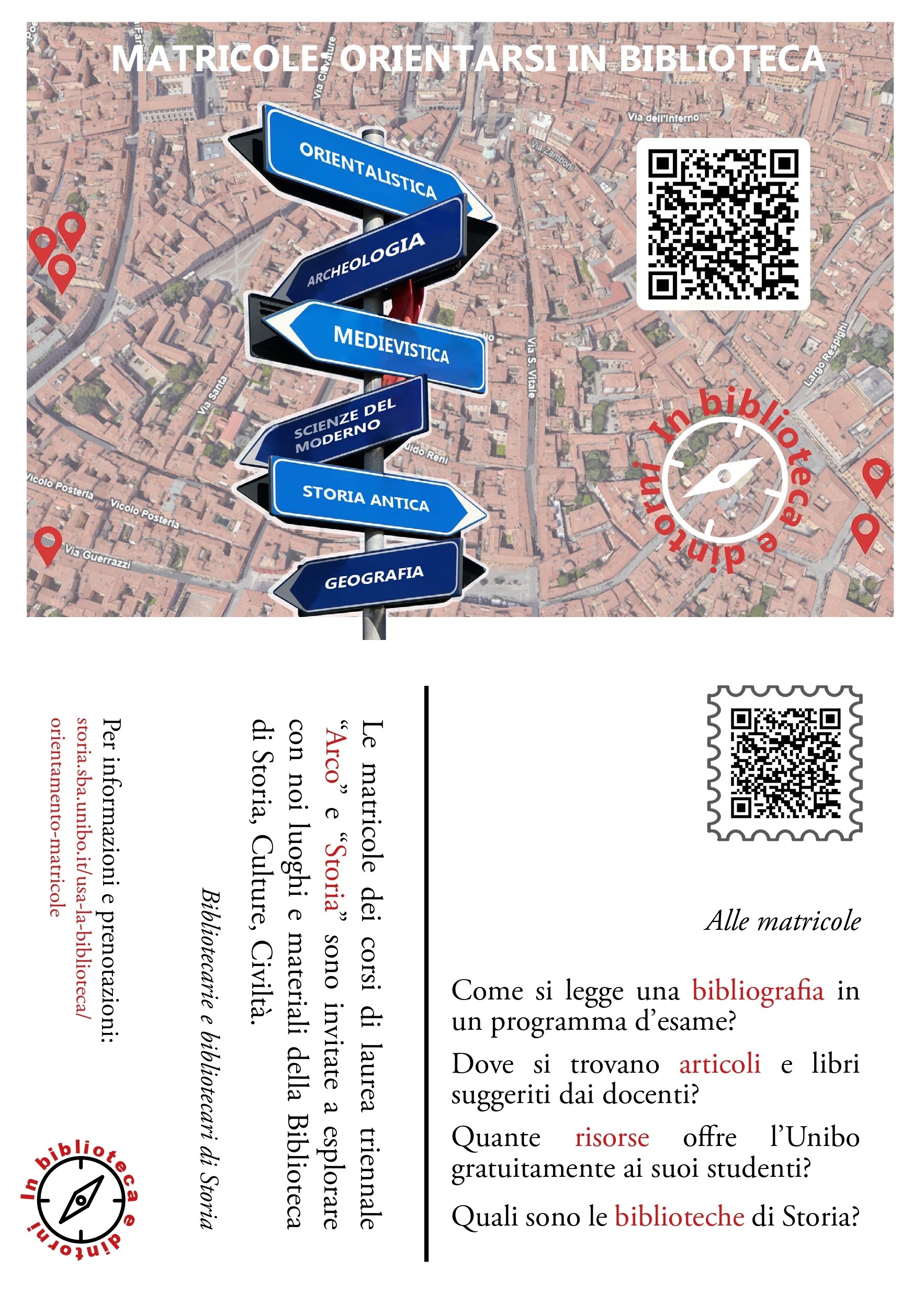Gli incontri si terranno sia in San Giovanni in Monte che in via Zamboni, nelle sezioni di Orientalistica e Storia Antica. Le matricole sono chiamate a iscriversi a uno solo degli incontri in calendario, della durata di due ore complessive, durante le quali verranno guidate a riconoscere, in forma laboratoriale, le differenti tipologie documentali e i corretti strumenti per ricercarle in formato cartaceo e/o elettronico. Infine un tour guidato li porterà a conoscere anche fisicamente luoghi e spazi in cui si troveranno a studiare.