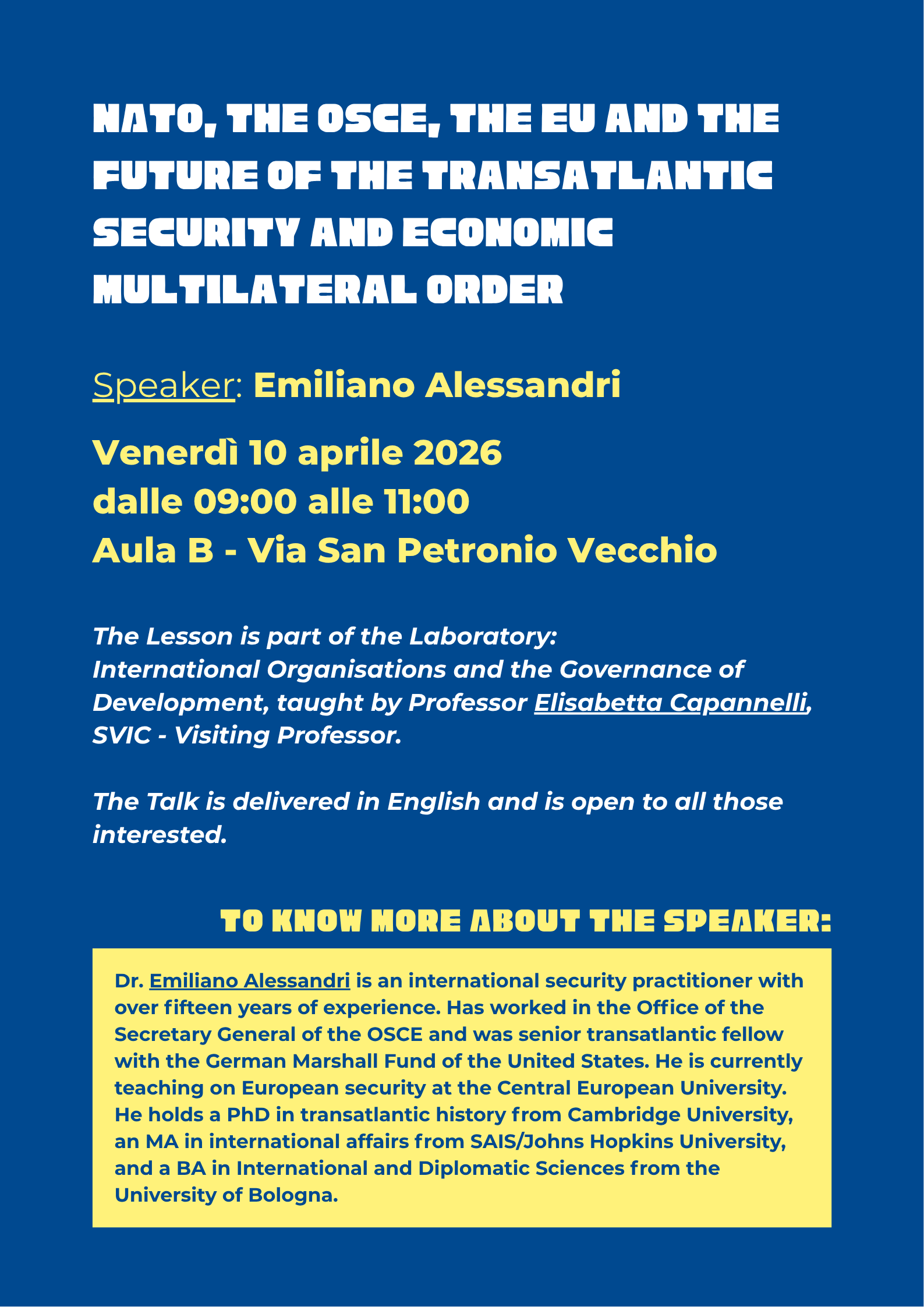 The Lesson is part of the Laboratory: International Organisations and the Governance of Development, taught by Professor Elisabetta Capannelli, SVIC - Visiting Professor.
