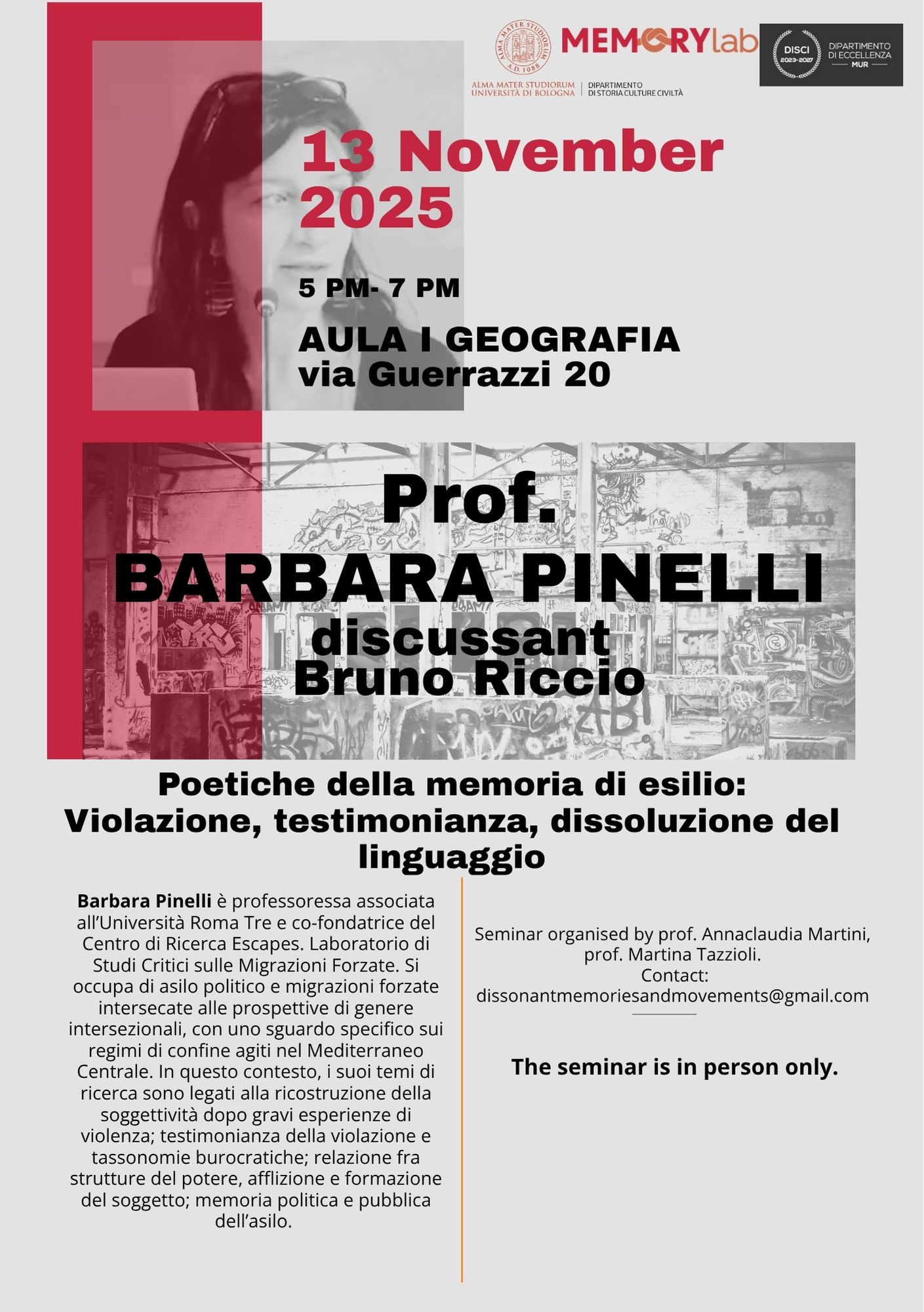 Poetiche della memoria di esilio: Violazione, testimonianza, dissoluzione del linguaggioa cura di Barbara Pinelli (Roma Tre)Discussant: Bruno Riccio