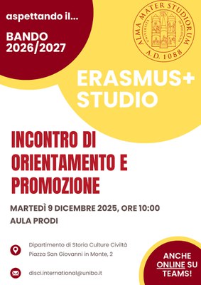Martedì 9 dicembre 2025 alle ore 10:00 in aula Prodi, presso la sede di San Giovanni in Monte, 2, si terrà il primo incontro programmato per promuovere l'opportunità Erasmus+ Studio, fra le studentesse e gli studenti del DiSCi.