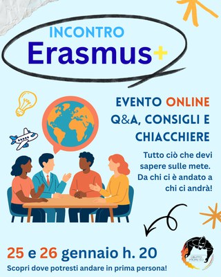 Evento online di condivisione delle esperienze su mobilità Erasmus e mete disponibili.