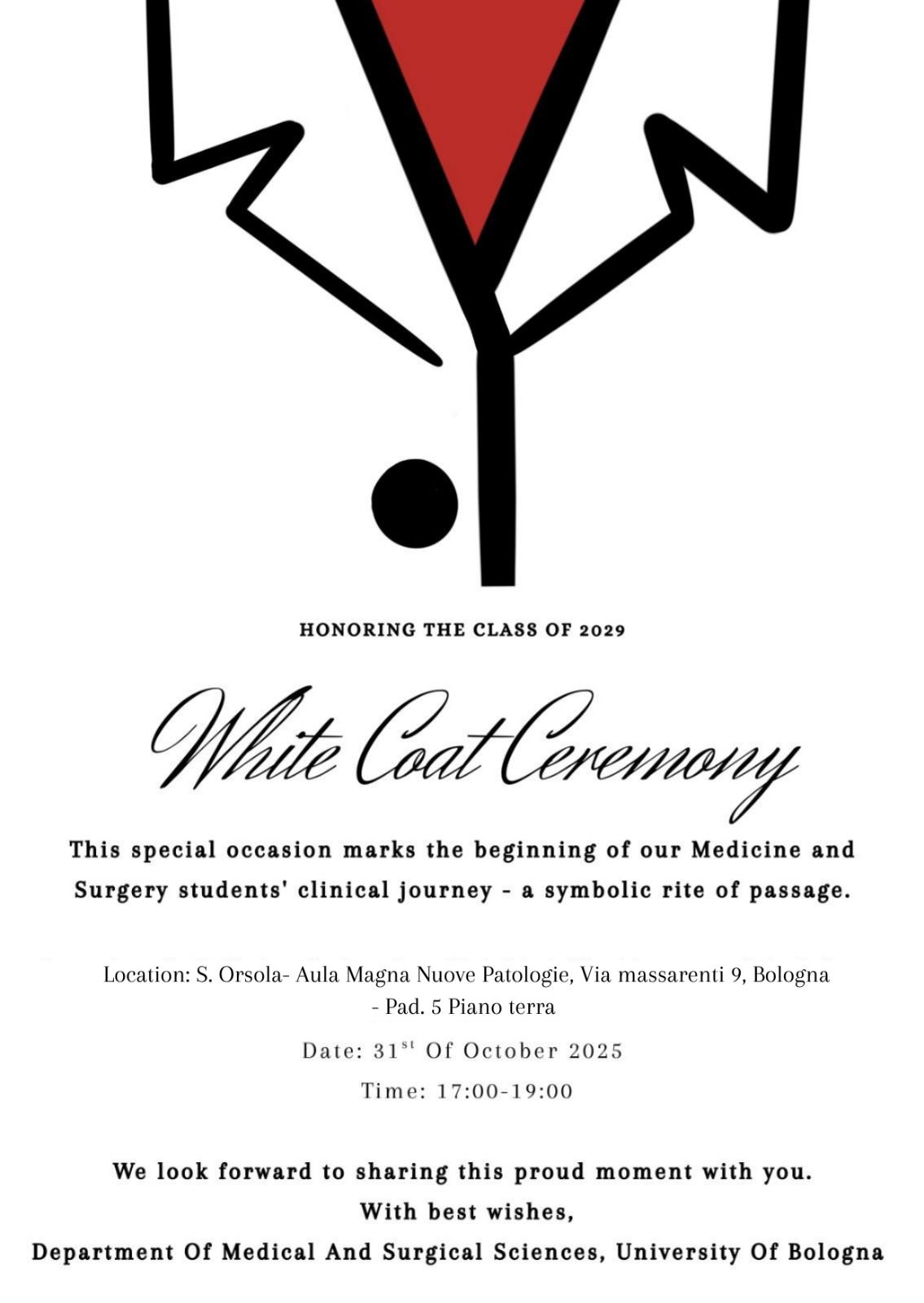 During the ceremony, personalized white coats will be handed to the students starting their third year, officially marking their entry into the clinical phase. The event will feature short speeches by professors, focusing on the meaning of entering clinical training, professional responsibility, and the expected conduct of future doctors.